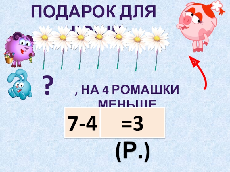 Подарок для нюши?, На 4 ромашки меньше7-4=3 (р.)