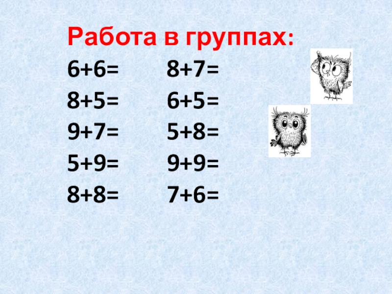Работа в группах:6+6=    8+7=8+5=    6+5=9+7=    5+8=5+9=
