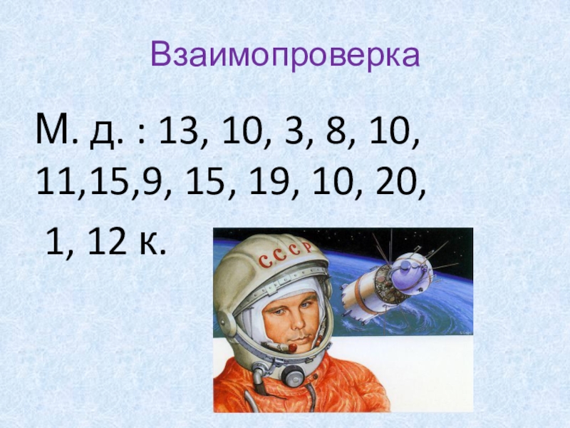 ВзаимопроверкаМ. д. : 13, 10, 3, 8, 10, 11,15,9, 15, 19, 10, 20, 1, 12 к.