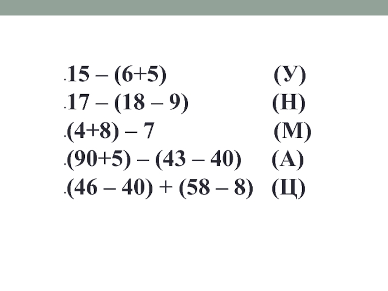 15 – (6+5) (У)17 – (18 – 9) (Н)(4+8) – 7 (М)(90+5) –