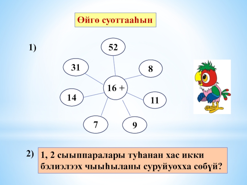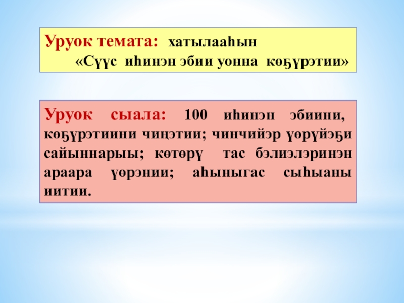 Уруок сыала: 100 иhинэн эбиини, көҕүрэтиини чиңэтии; чинчийэр үөрүйэҕи сайыннарыы; көтөрү тас бэлиэлэринэн араара үөрэнии; аhыныгас сыhыаны иитии.