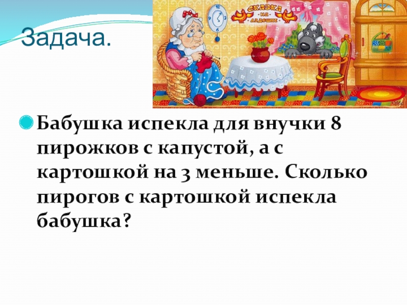 Задача. Бабушка испекла для внучки 8 пирожков с капустой, а с картошкой на 3 меньше. Сколько пирогов