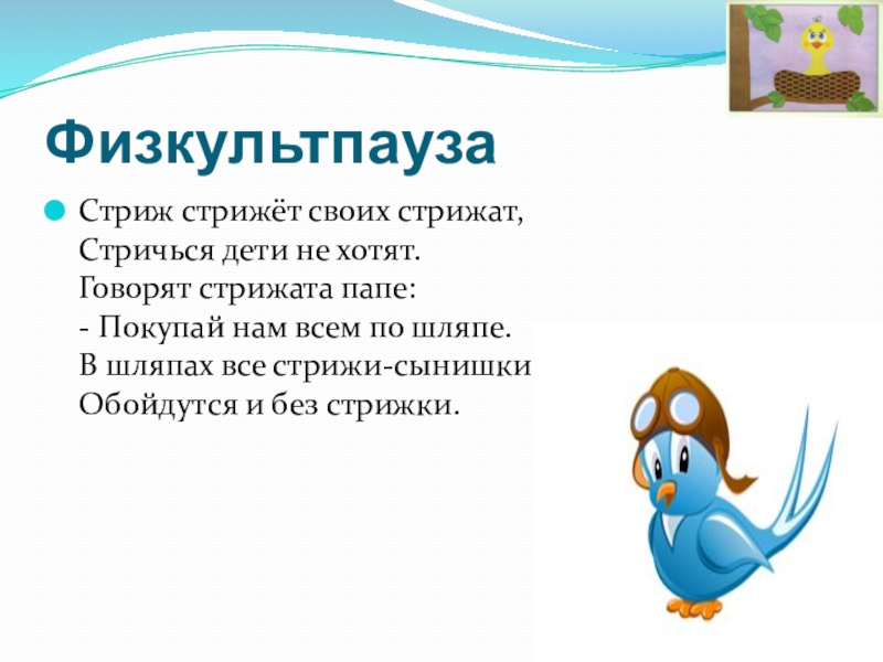 ФизкультпаузаСтриж стрижёт своих стрижат, Стричься дети не хотят. Говорят стрижата папе: - Покупай нам всем по шляпе.