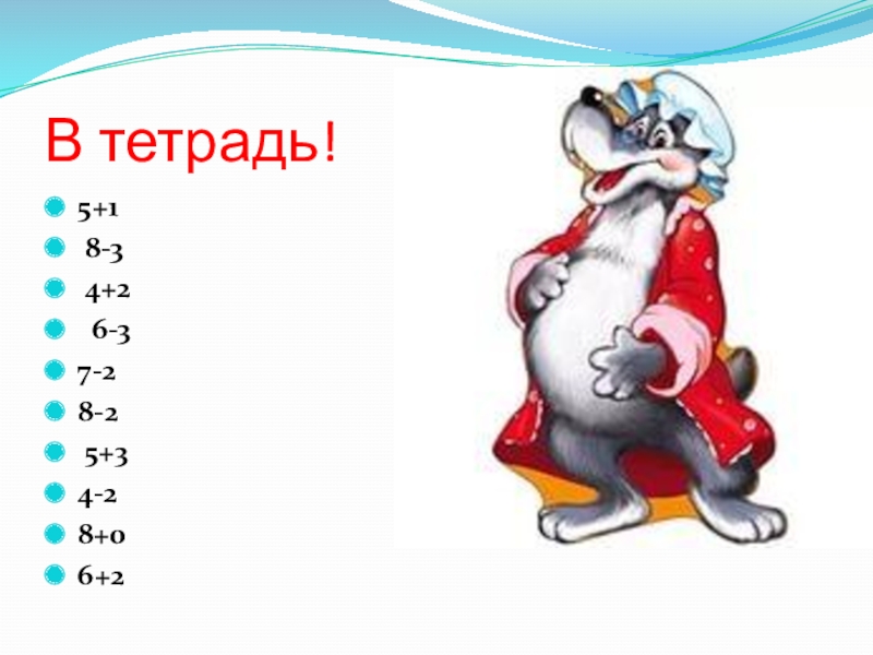 В тетрадь!5+1  8-3  4+2  6-3  7-2  8-2  5+3  4-2  8+0  6+2