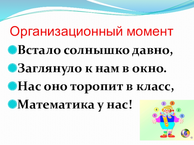 Организационный моментВстало солнышко давно,Заглянуло к нам в окно.Нас оно торопит в класс,Математика у нас!