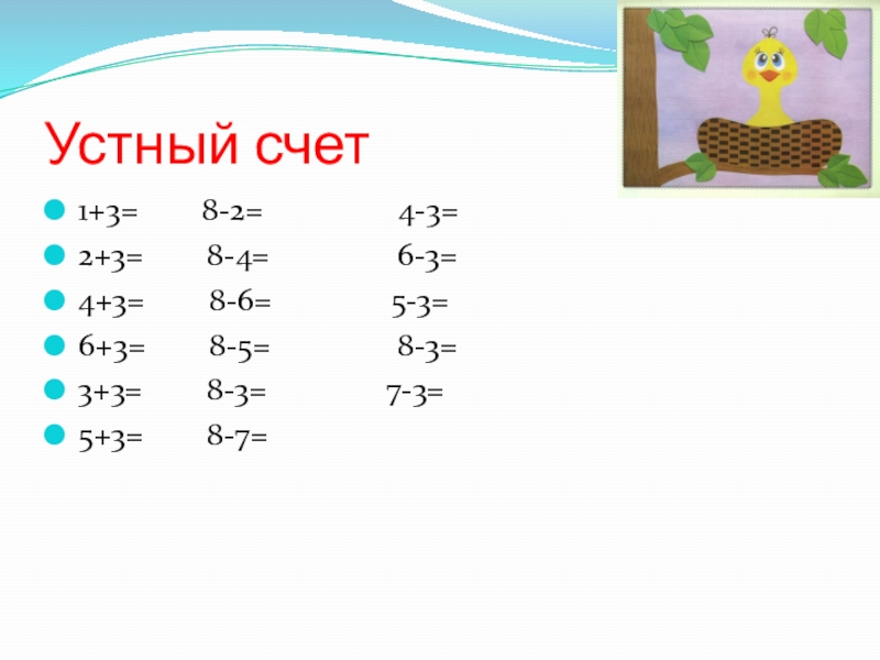 Устный счет1+3=        8-2=                 4-3=2+3=        8-4=                6-3=4+3=        8-6=               5-3=