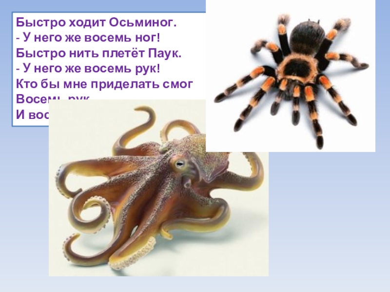 Слайд 2Быстро ходит Осьминог. - У него же восемь ног! Быстро нить плетёт Паук. -