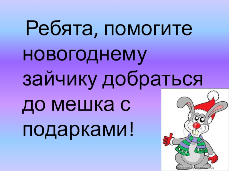 Слайд 12 Ребята, помогите новогоднему зайчику добраться до мешка с подарками!
