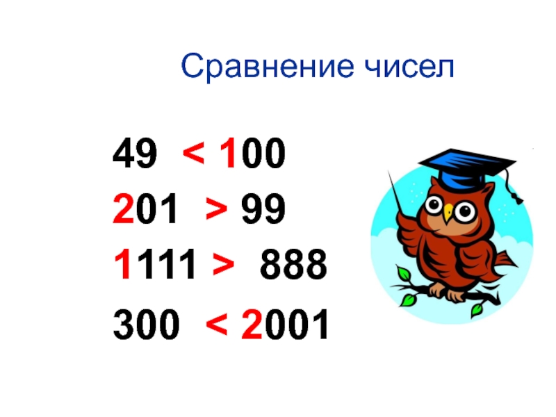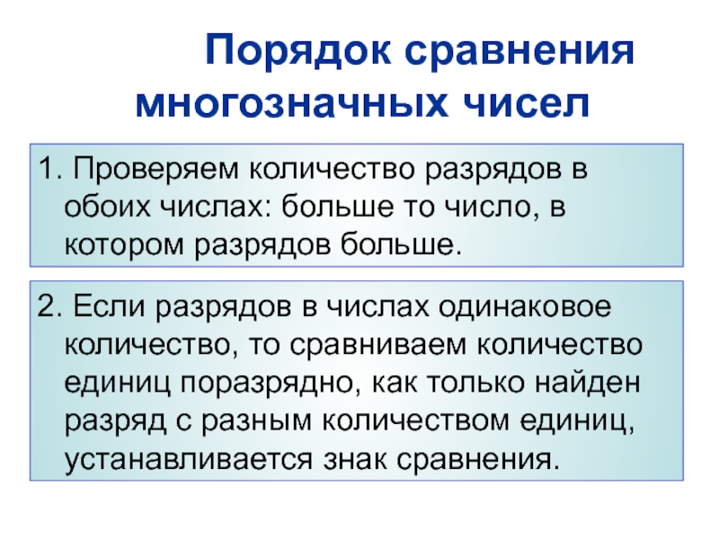 2. Если разрядов в числах одинаковое количество, то сравниваем количество единиц поразрядно, как только найден разряд с разным количеством единиц, устанавливается знак сравнения.