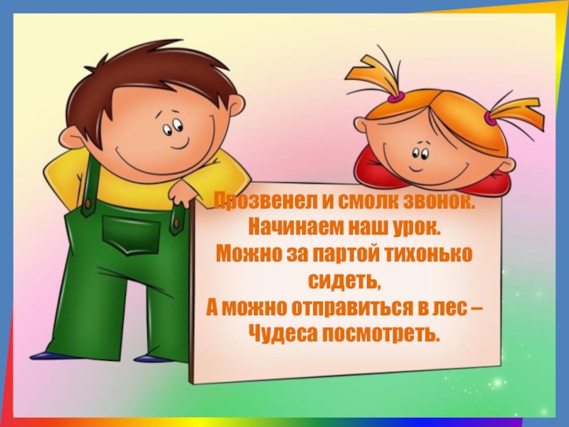 Прозвенел и смолк звонок. Начинаем наш урок. Можно за партой тихонько сидеть, А можно отправиться в лес – Чудеса посмотреть.