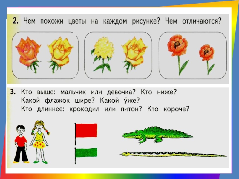 Презентация, доклад по математике Сравнение по форме, цвету, размеру (1 класс)