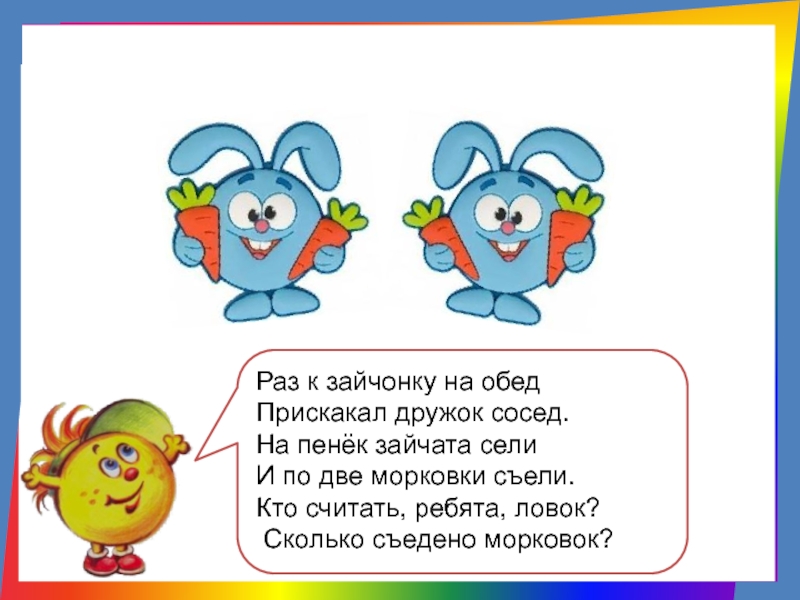 Раз к зайчонку на обед Прискакал дружок сосед.На пенёк зайчата сели И по две морковки съели.Кто считать,