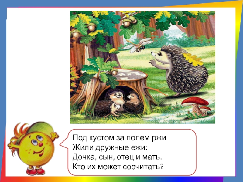 Под кустом за полем ржи  Жили дружные ежи:  Дочка, сын, отец и мать.  Кто их может сосчитать?