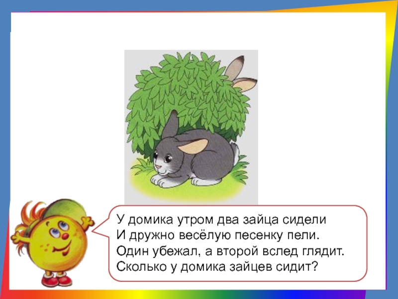 У домика утром два зайца сиделиИ дружно весёлую песенку пели.Один убежал, а второй вслед глядит.Сколько у домика