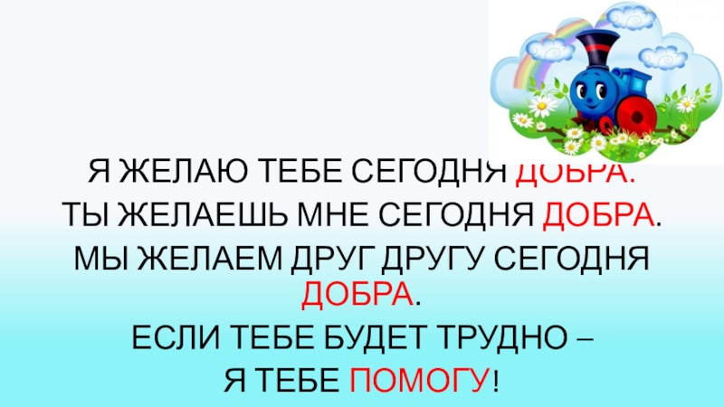 Я ЖЕЛАЮ ТЕБЕ СЕГОДНЯ ДОБРА.ТЫ ЖЕЛАЕШЬ МНЕ СЕГОДНЯ ДОБРА.МЫ ЖЕЛАЕМ ДРУГ ДРУГУ СЕГОДНЯ ДОБРА.ЕСЛИ ТЕБЕ БУДЕТ ТРУДНО – Я ТЕБЕ ПОМОГУ!