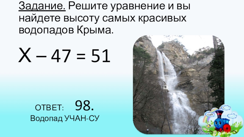 Задание. Решите уравнение и вы найдете высоту самых красивых водопадов Крыма.Х – 47 = 51ОТВЕТ: