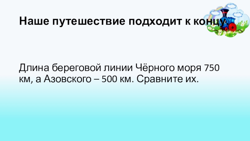 Наше путешествие подходит к концу.Длина береговой линии Чёрного моря 750 км, а Азовского – 500 км. Сравните