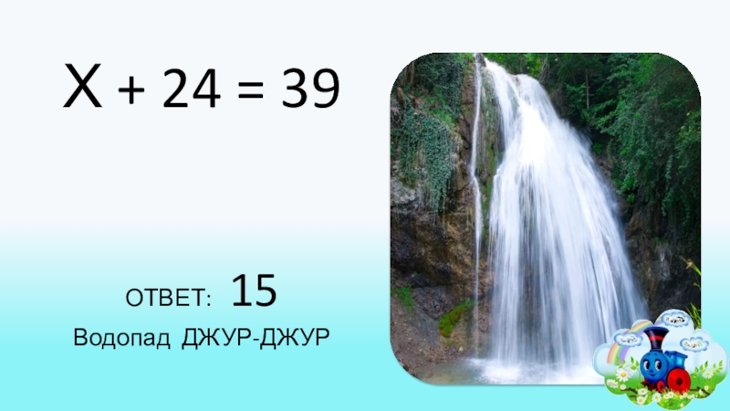 Х + 24 = 39ОТВЕТ:  15Водопад ДЖУР-ДЖУР