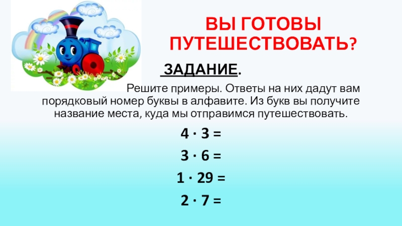 Решите примеры. Ответы на них дадут вам порядковый номер буквы в алфавите. Из букв вы получите название места, куда мы отправимся путешествовать.