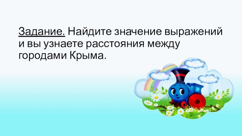 Слайд 28Задание. Найдите значение выражений и вы узнаете расстояния между городами Крыма.