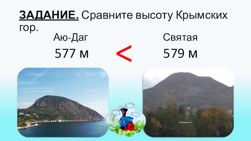 ЗАДАНИЕ. Сравните высоту Крымских гор.Аю-Даг   577 мСвятая   579 м