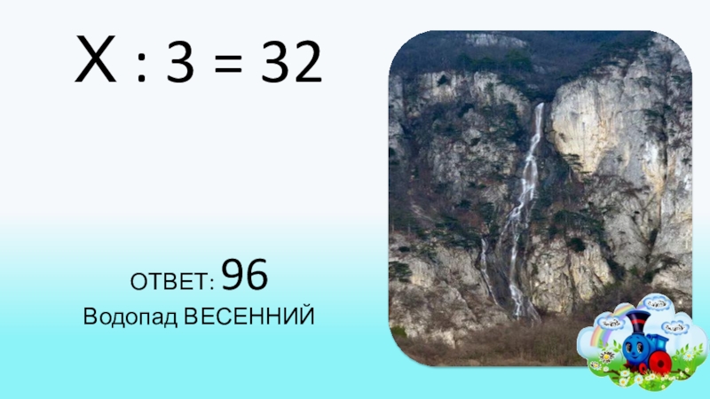 Х : 3 = 32ОТВЕТ: 96Водопад ВЕСЕННИЙ