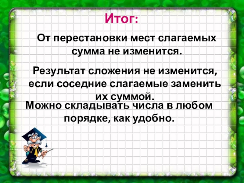 Результат сложения не изменится, если соседние слагаемые заменить их суммой.
