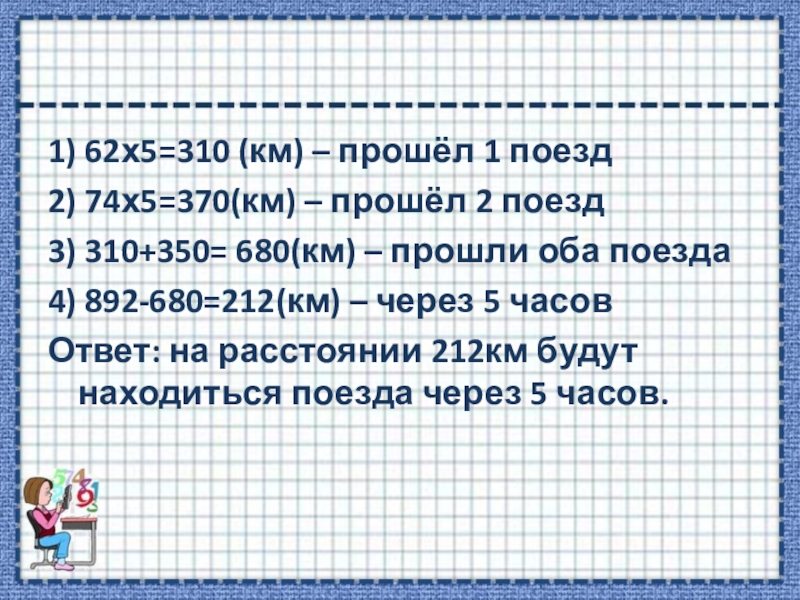1) 62х5=310 (км) – прошёл 1 поезд2) 74х5=370(км) – прошёл 2 поезд3) 310+350= 680(км) – прошли оба