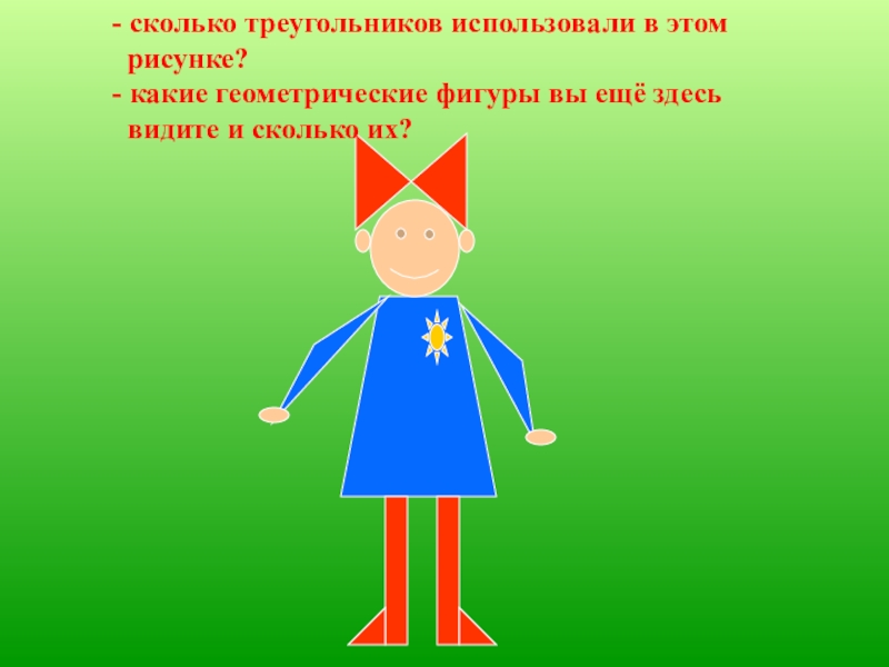 - сколько треугольников использовали в этом   рисунке? - какие геометрические фигуры вы ещё здесь