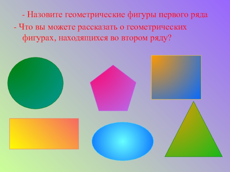 - Назовите геометрические фигуры первого ряда- Что вы можете рассказать о геометрических фигурах, находящихся во втором ряду?