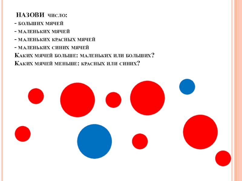 НАЗОВИ число: - больших мячей - маленьких мячей - маленьких красных мячей - маленьких синих мячей Каких мячей больше: маленьких или больших? Каких мячей меньше: красных или синих?