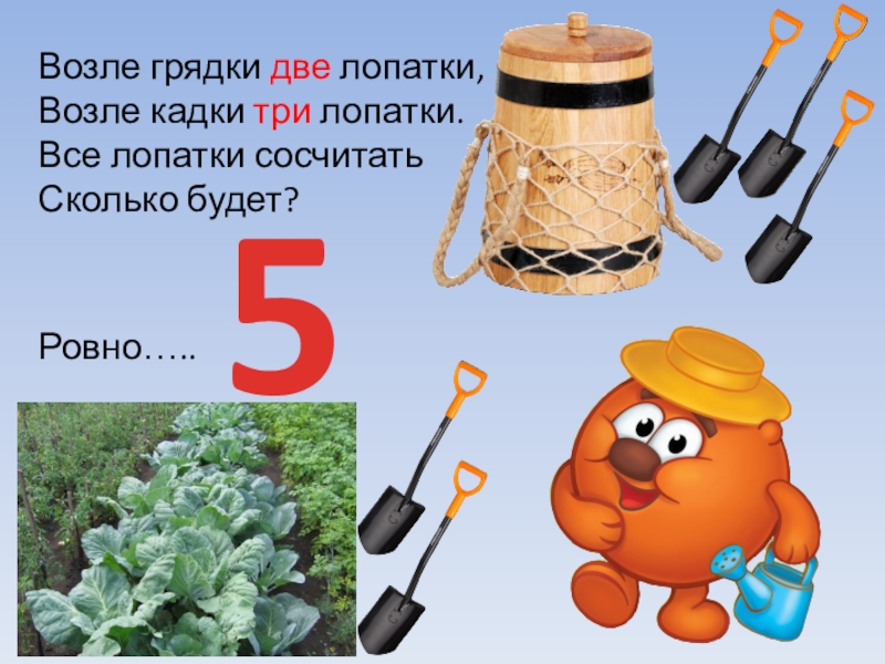 Возле грядки две лопатки,Возле кадки три лопатки. Все лопатки сосчитать Сколько будет?Ровно…..5