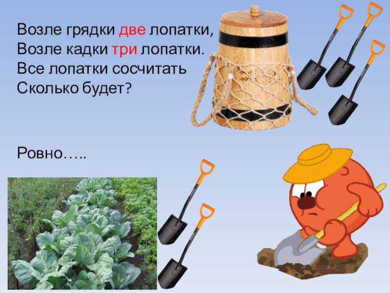Возле грядки две лопатки,Возле кадки три лопатки. Все лопатки сосчитать Сколько будет?Ровно…..