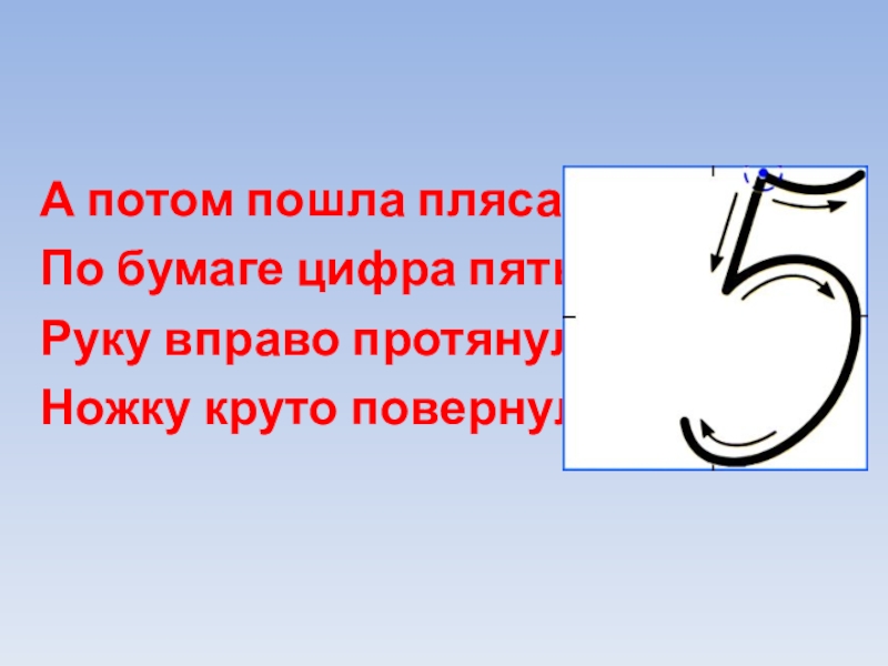 А потом пошла плясатьПо бумаге цифра пять. Руку вправо протянула, Ножку круто повернула.