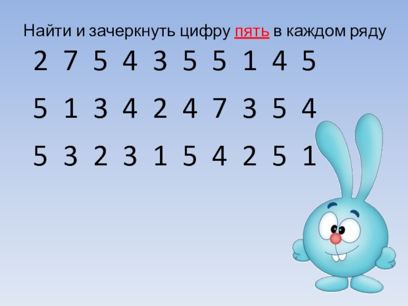 Найти и зачеркнуть цифру пять в каждом ряду  2 7 5 4 3 5