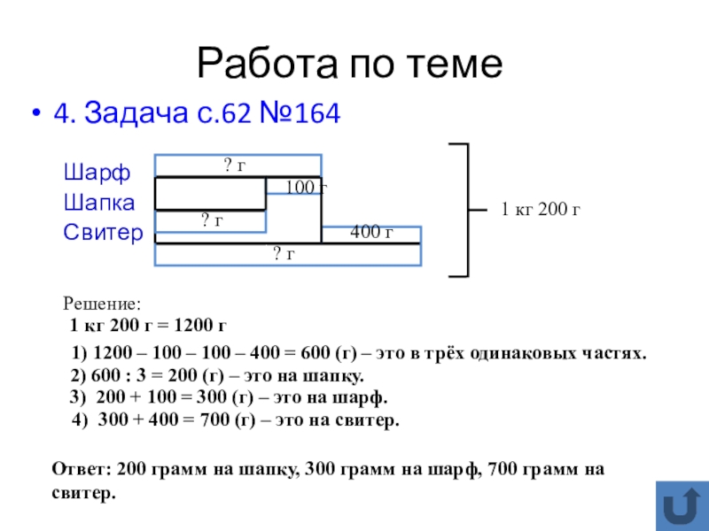 1) 1200 – 100 – 100 – 400 = 600 (г) – это в трёх одинаковых частях.