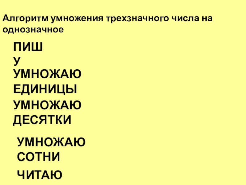 Алгоритм умножения трехзначного числа на однозначноеПИШУУМНОЖАЮ ЕДИНИЦЫУМНОЖАЮ ДЕСЯТКИУМНОЖАЮ СОТНИЧИТАЮ ОТВЕТ