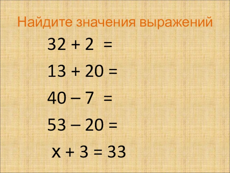 Найдите значения выражений32 + 2 =     13 + 20 = 40 – 7