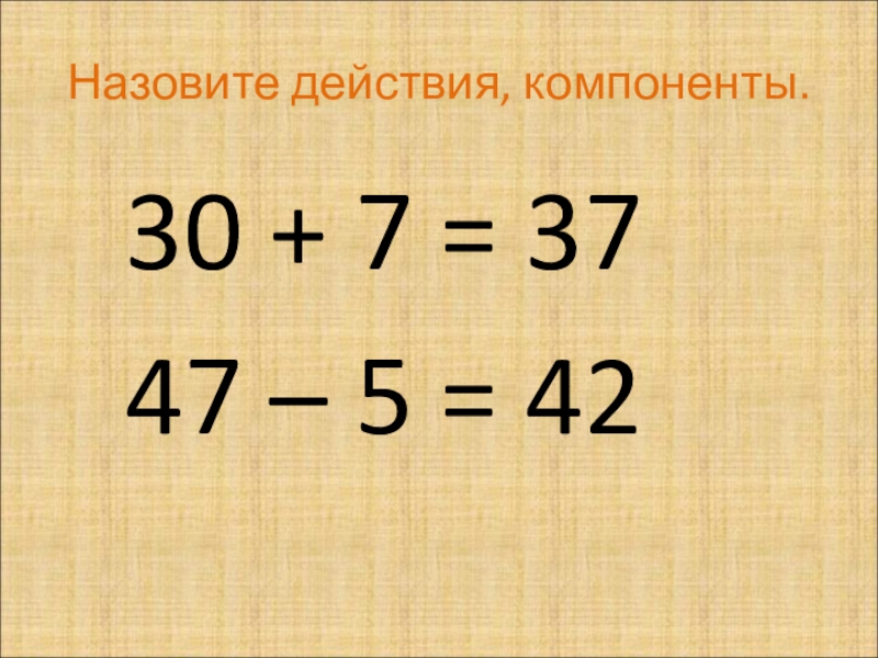 Назовите действия, компоненты.30 + 7 = 37      47 – 5 = 42