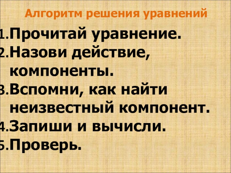 Алгоритм решения уравненийПрочитай уравнение.Назови действие, компоненты.Вспомни, как найти неизвестный компонент.Запиши и вычисли.Проверь.