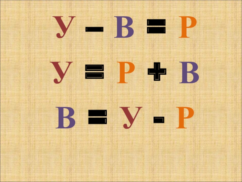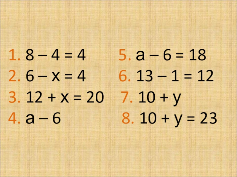 – 6 = 18 2. 6 – х = 4 6. 13 – 1 = 12 3. 12 + х = 20 7. 10 + у 4. а – 6 8. 10 + у = 23