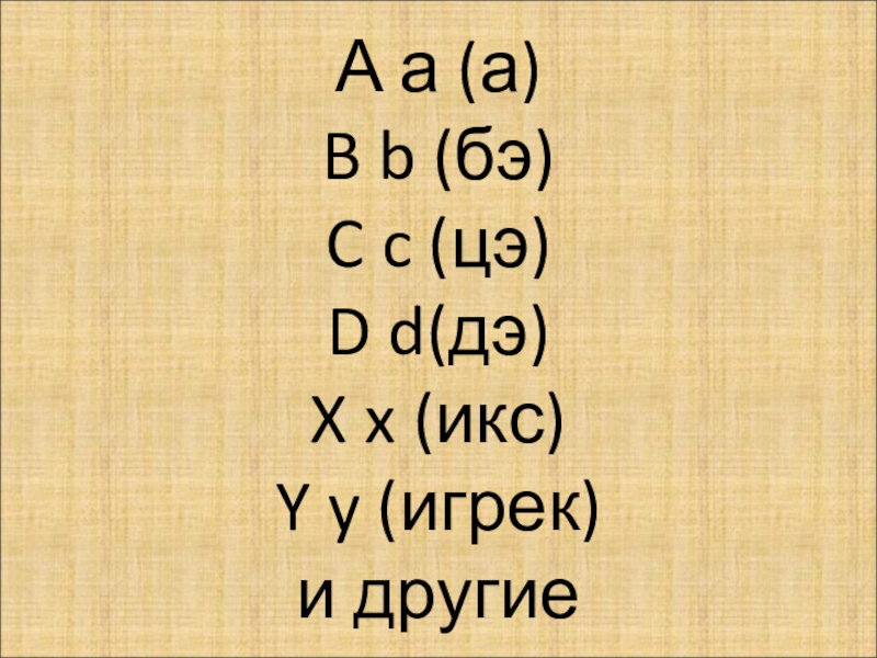 А а (а) B b (бэ) C c (цэ) D d(дэ) X x (икс) Y y (игрек)