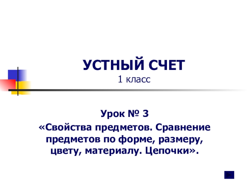 УСТНЫЙ СЧЕТ 1 классУрок № 3 «Свойства предметов. Сравнение предметов по форме, размеру, цвету, материалу. Цепочки».