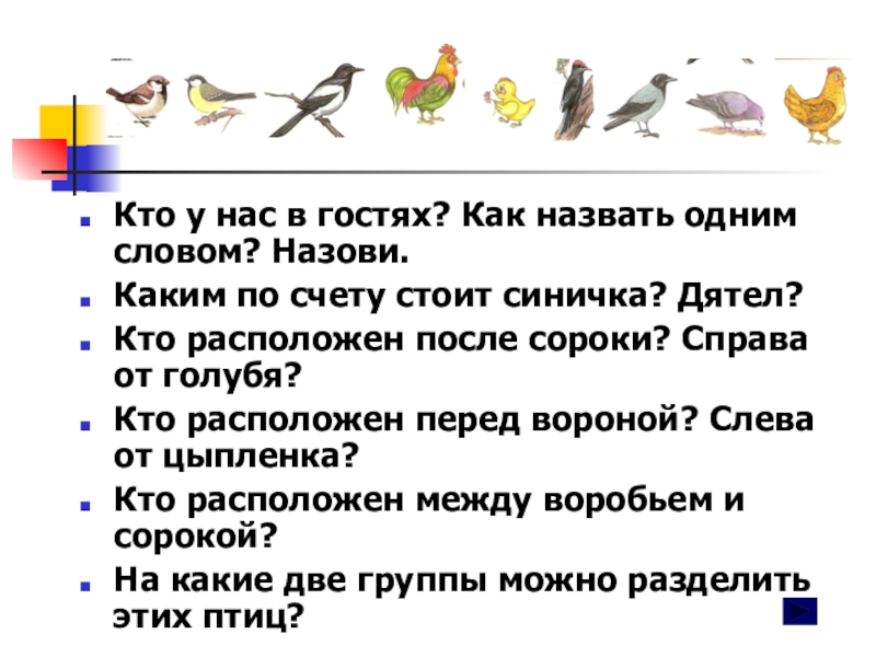 Кто у нас в гостях? Как назвать одним словом? Назови.Каким по счету стоит синичка? Дятел? Кто расположен после сороки? Справа от голубя?Кто расположен перед вороной? Слева от цыпленка?Кто расположен между воробьем и сорокой?На какие две группы
