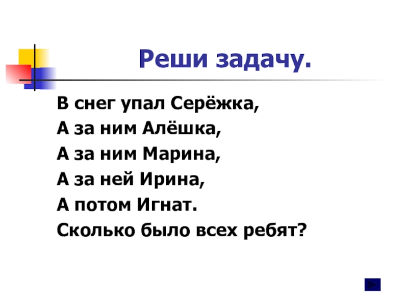 Реши задачу.В снег упал Серёжка,А за ним Алёшка,А за ним Марина, А за ней Ирина,А потом Игнат.Сколько