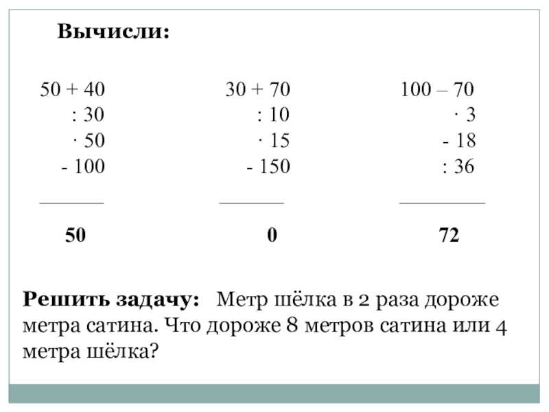 Решить задачу: Метр шёлка в 2 раза дороже метра сатина. Что дороже 8 метров сатина или 4 метра шёлка?