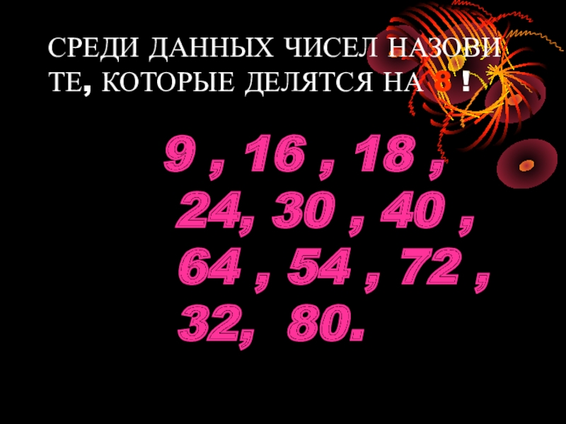 Слайд 6СРЕДИ ДАННЫХ ЧИСЕЛ НАЗОВИ ТЕ, КОТОРЫЕ ДЕЛЯТСЯ НА 8 !