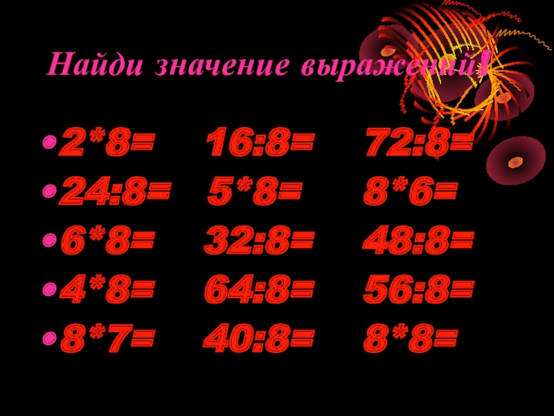 Найди значение выражений!2*8=  16:8=  72:8=24:8=  5*8=   8*6=6*8=  32:8=  48:8=4*8=