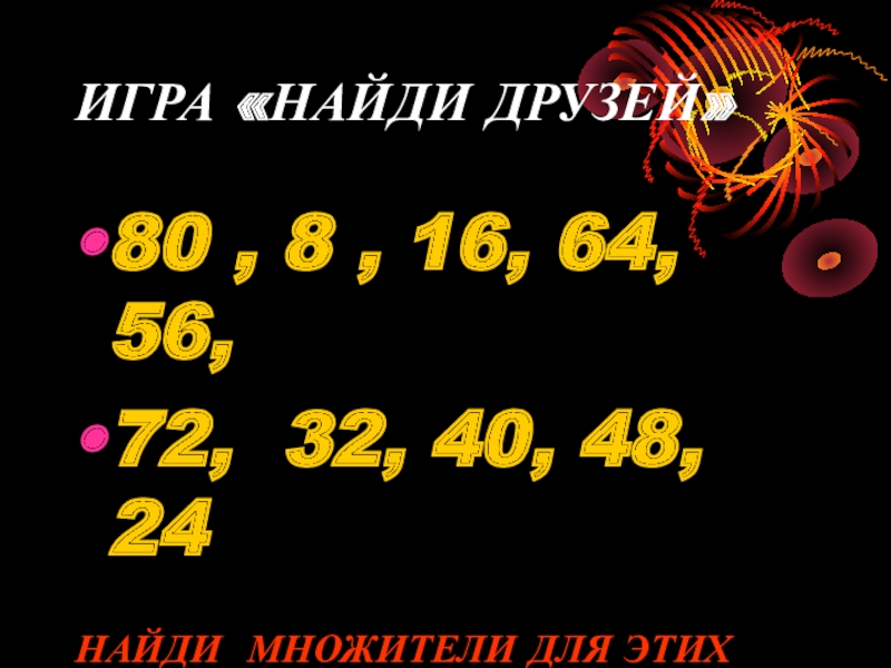 ИГРА «НАЙДИ ДРУЗЕЙ»80 , 8 , 16, 64, 56,72, 32, 40, 48, 24НАЙДИ МНОЖИТЕЛИ ДЛЯ ЭТИХЗНАЧЕНИЙ ПРОИЗВЕДЕНИЙ!