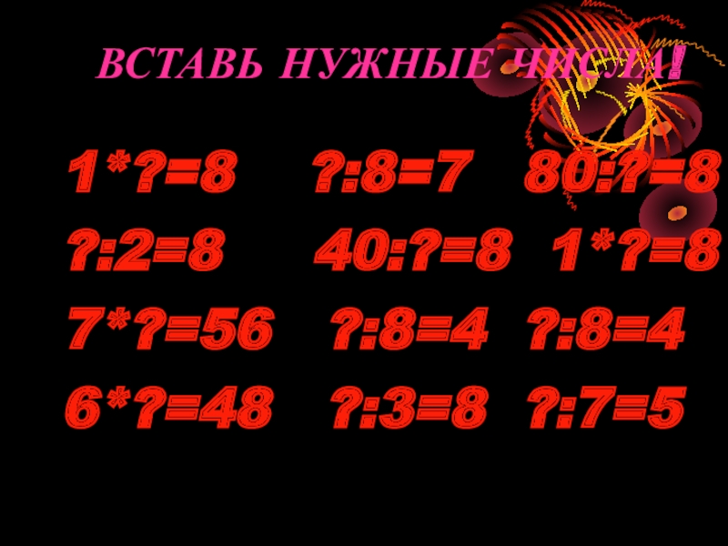 ВСТАВЬ НУЖНЫЕ ЧИСЛА!1*?=8  ?:8=7  80:?=8?:2=8   40:?=8 1*?=87*?=56  ?:8=4 ?:8=46*?=48  ?:3=8 ?:7=5